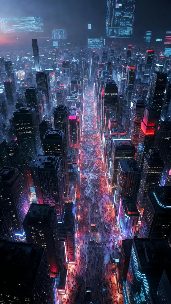 A massive vertical aerial view overlooking a futuristic urban canyon. Thousands of tiny, silhouetted figures pack a central thoroughfare that glows with a vibrant, fiery pink and orange light. The street is lined with towering skyscrapers featuring a mix of dark metallic surfaces and bright neon accents in cyan, red, and purple. Holographic data streams and digital interfaces float in the upper atmosphere against a hazy, pre-dawn sky. The sheer scale of the buildings and the density of the crowd evoke a high-tech, high-pressure societal environment.
