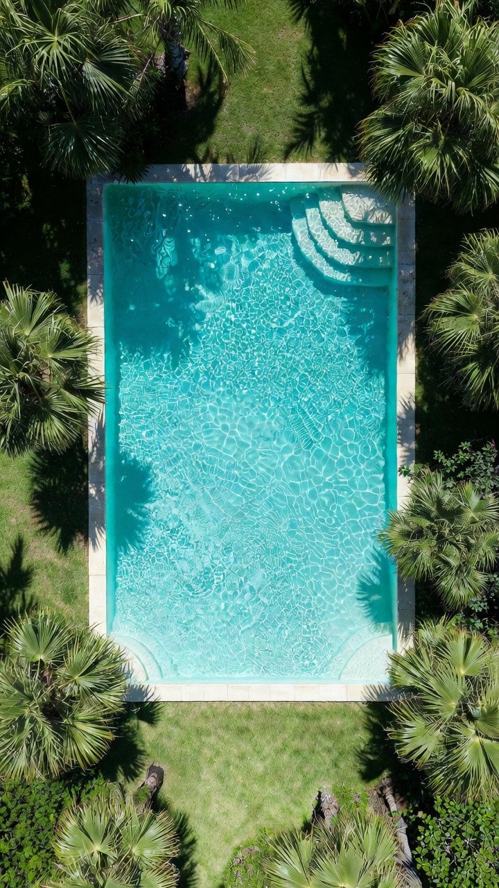 Escape to a private tropical paradise every time you unlock your screen! This stunning aerial wallpaper captures a perfect, crystal-clear turquoise swimming pool hidden away among lush green palm trees. The bright summer sunlight creates mesmerizing water ripples and beautifully cast tropical shadows on the surrounding grass. With its refreshing, luxurious, and clean aesthetic, this top-down view is the ultimate summer getaway for your phone.